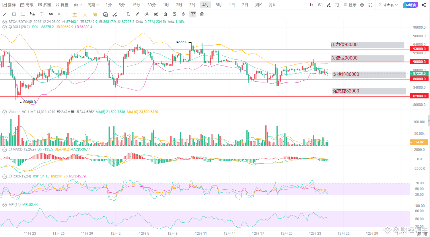 目前价格87228美元,被BOLL中轨压着上不去,上轨还在89669,根本摸不到。