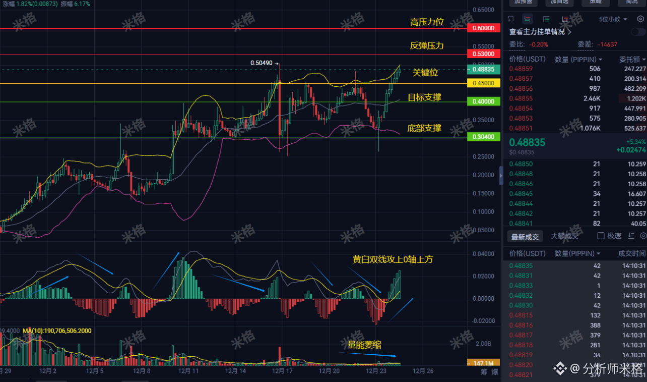 结合消息和技术,我的观点很直接:PIPPIN今天整体上涨,但后市大概率走分化。如果放量突破0.5,那可能试探0.55甚至0.6,走一波冲高行情。如果量能持续萎缩,价格在关键位震荡后跌破,很可能回踩0.4支撑,极端情况去0.304底部找机会。
