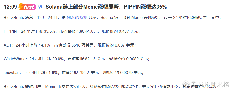 Solana链上Meme币集体发疯,PIPPIN 24小时暴涨35.5%,市值冲到4.86亿美元,现价约0.487美元。
