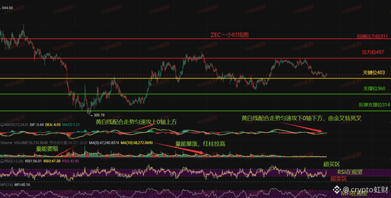 在交易里,我信一句话:下跌趋势中的反弹,都是给你逃命用的。ZEC从高点下来,30天跌了近三成,这说明空头力量绝对占优。我的判断很直接:短期内想直接冲到511,几乎不可能。 更大的可能,是在403-457这个区间反复震荡,如果403撑不住,大概率会去360找支撑。现在抄底,就像伸手去接正在落下的刀。