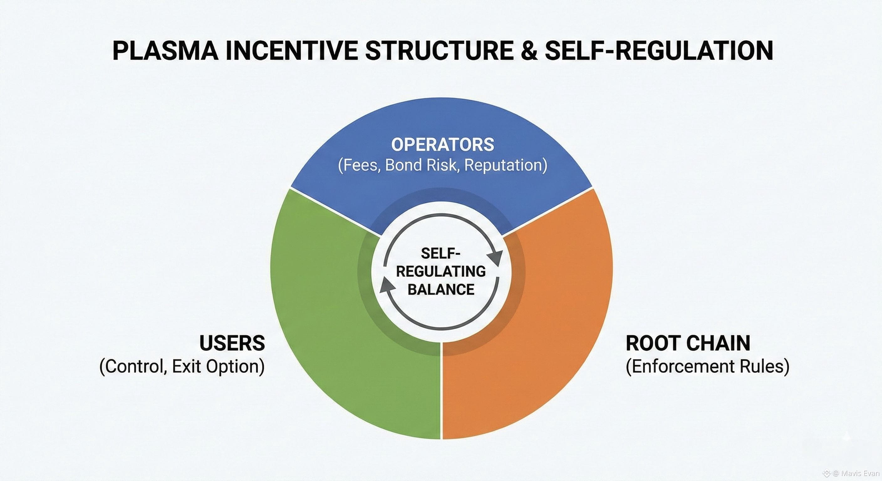 The economic incentives embedded in Plasma are what make this possible. Operators earn fees by processing transactions and maintaining availability. Validators or operators who behave dishonestly risk losing bonded assets and future revenue. Users retain control because they can exit if they lose confidence. This triangular balance between operators, users, and the root chain creates a self-regulating environment where rational behavior dominates.