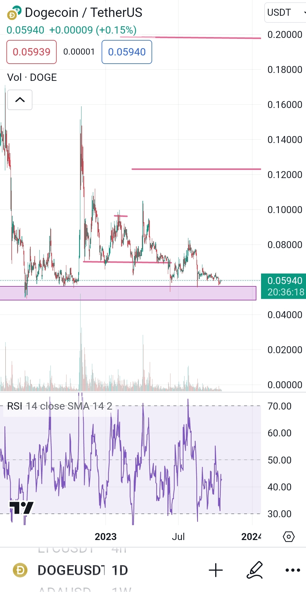 DOge nadal ma świece wsparcia, pokazujące silną strefę wsparcia. Wolumen pozostaje niski, pomimo silnych wzrostów dla innych altcoinów. Proszę trzymać ręce nieruchomo!