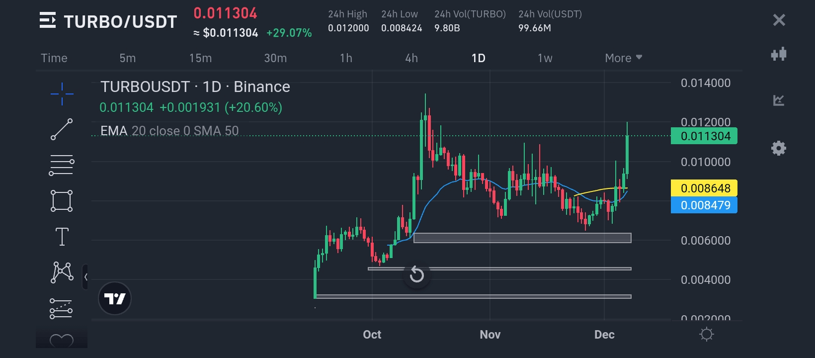 Para TURBO/USDT przykuła uwagę traderów wzrostem o +20,60%, wykazując znaczący byczy impet. Przyjrzyjmy się kluczowym szczegółom technicznym i temu, co mogą one oznaczać dla rynku.