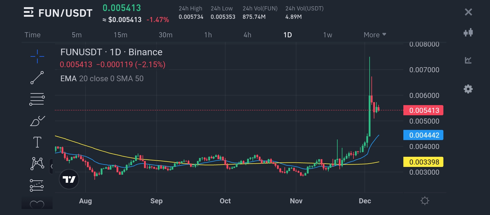 Ruch cenowy: Po wzroście do niedawnego maksimum na poziomie 0,007 $, FUN/USDT cofnęło się do obecnego poziomu 0,00541 $, co oznacza spadek o -2,15 % w ciągu ostatnich 24 godzin. Ta korekta następuje po silnym wzroście w ostatnich tygodniach.