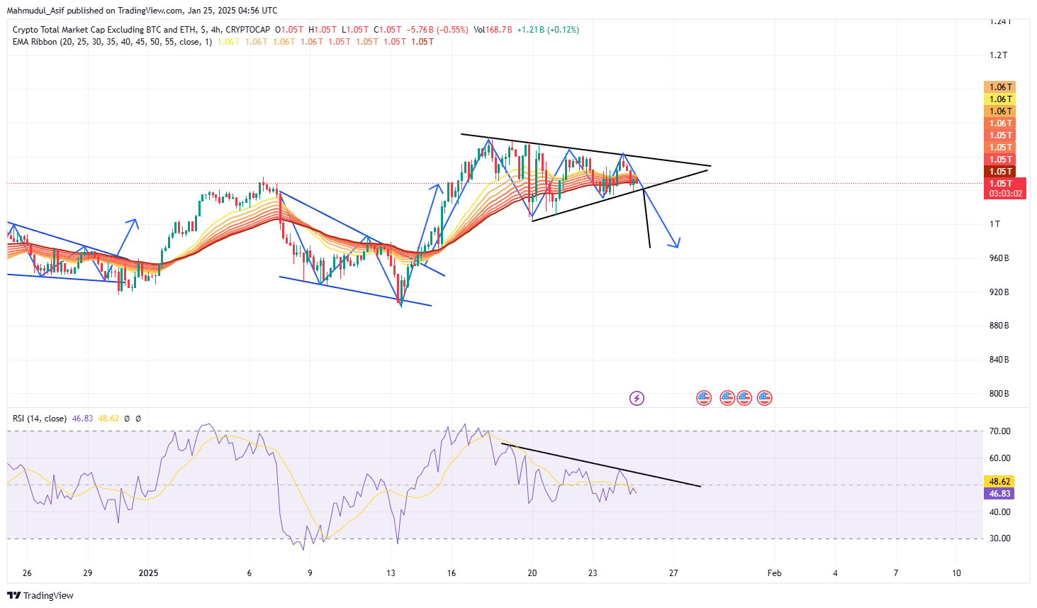 Jeśli spojrzymy na rynek total3, widzimy symetryczny wzór. Z powodu presji sprzedaży. Myślimy, że jeśli wszyscy sprzedają swoje transakcje i monety, te świece stworzą byczą flagę na następny ruch. EMA i RSI pokazują presję spadkową. Również BTC.D wspiera tę analizę. Co oznacza, że możemy zobaczyć minimalną presję spadkową w altcoinach.