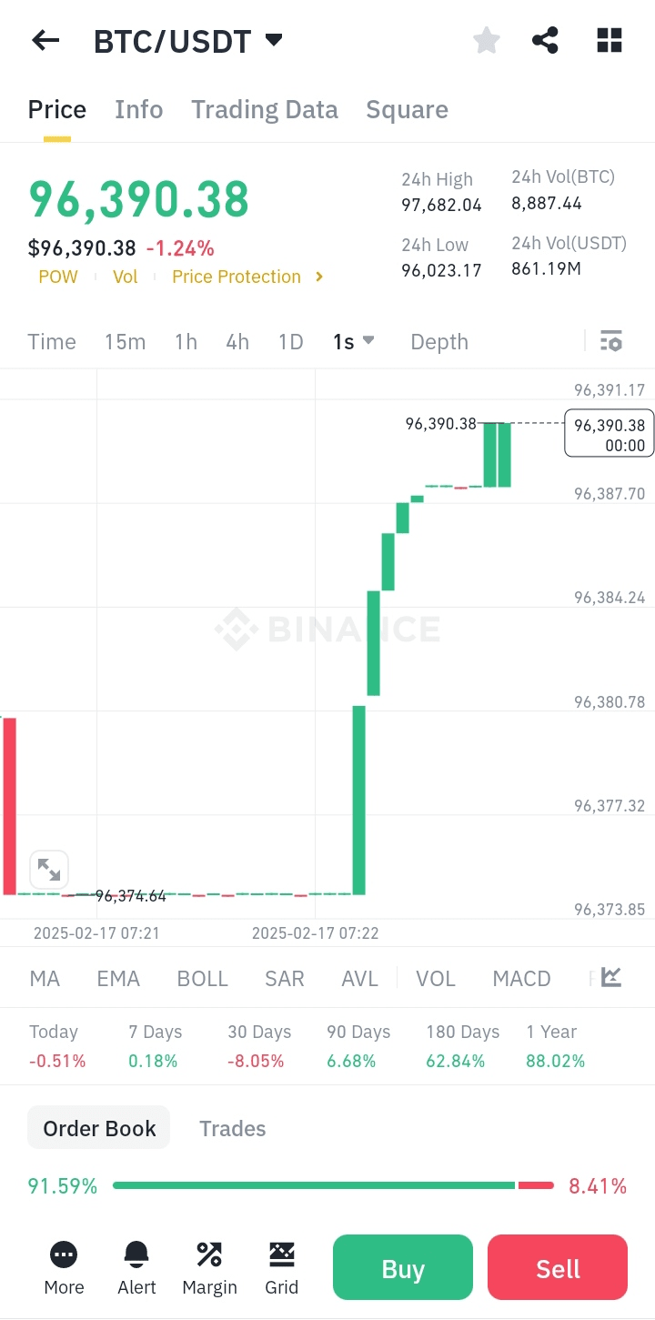 Cena BTC/USDT: 96 390,38 USD (-1,24% w ciągu ostatnich 24 godzin)