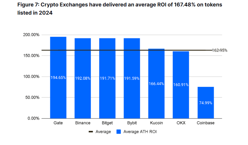 Ogólnie rzecz biorąc, ubiegły rok był dobry dla notowań kryptowalut na giełdach CEX za pośrednictwem kilku protokołów uruchomieniowych, ponieważ nie wypadły one źle. Dane pokazują średni zwrot z inwestycji na poziomie 167,48%, przy czym Gate.io, Binance, Bitget i Bybit notowały średnio najlepsze wyniki w 2024 roku.