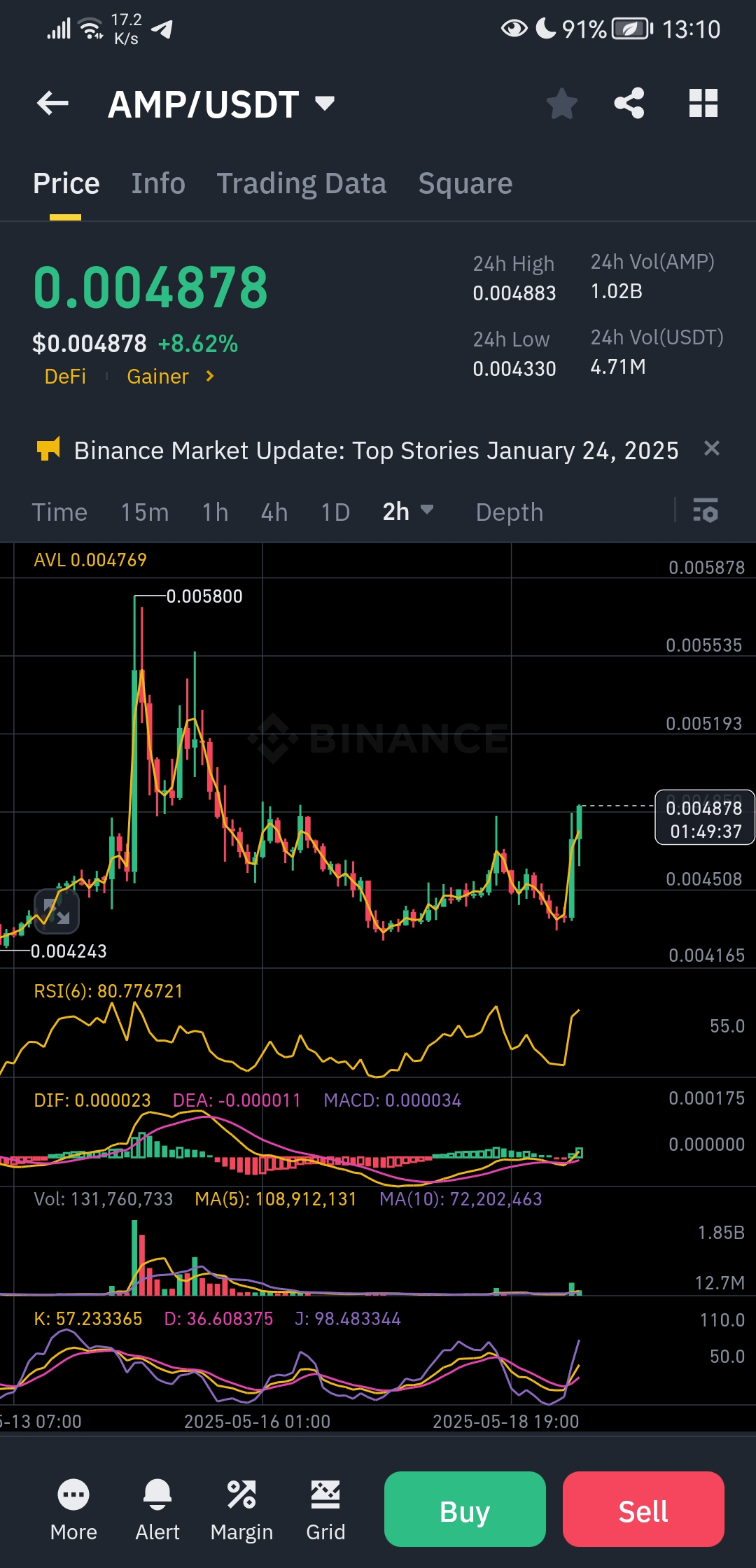 AMP wzrosło do $0.004878, silnie odbijając się od niedawnego minimum $0.00433. Z 24h maksimum tuż powyżej na $0.004883, byki mocno naciskają. Odbicie tego szczytu $0.0058 może to uruchomić!