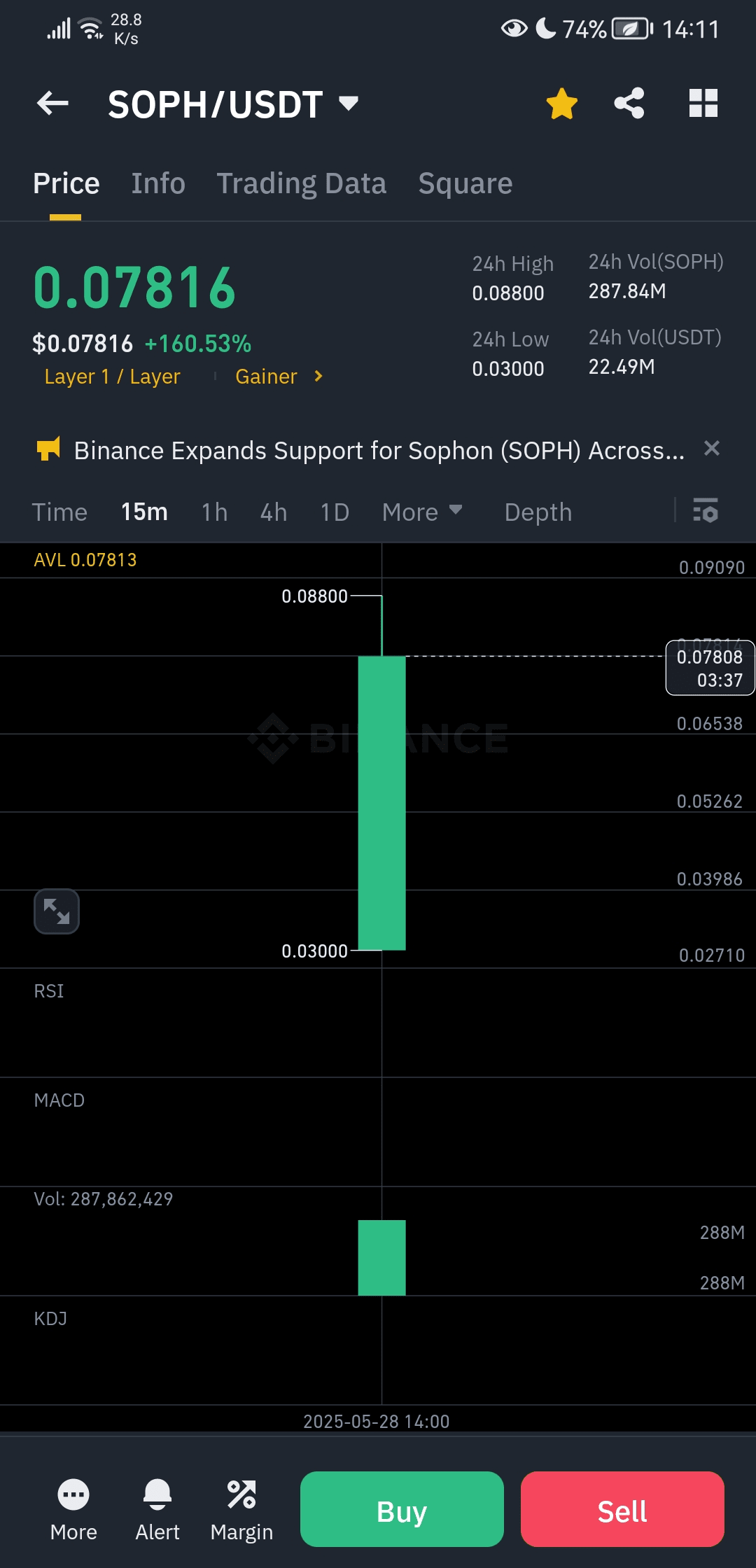 Momentum: Ekstremalny ruch wybijający sugeruje silny popyt; ostrożność przy późnych wejściach.$SOPH