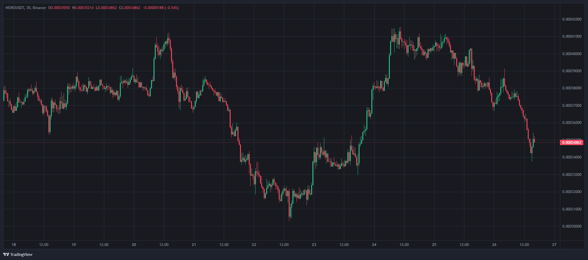 ✅ NEIRO w ostrym spadku! Po tym, jak wzbił się wysoko na poziomie około 0,00042000 $, wydaje się, że zdecydował się na gwałtowny spadek. Jakby grawitacja nagle się podwoiła!