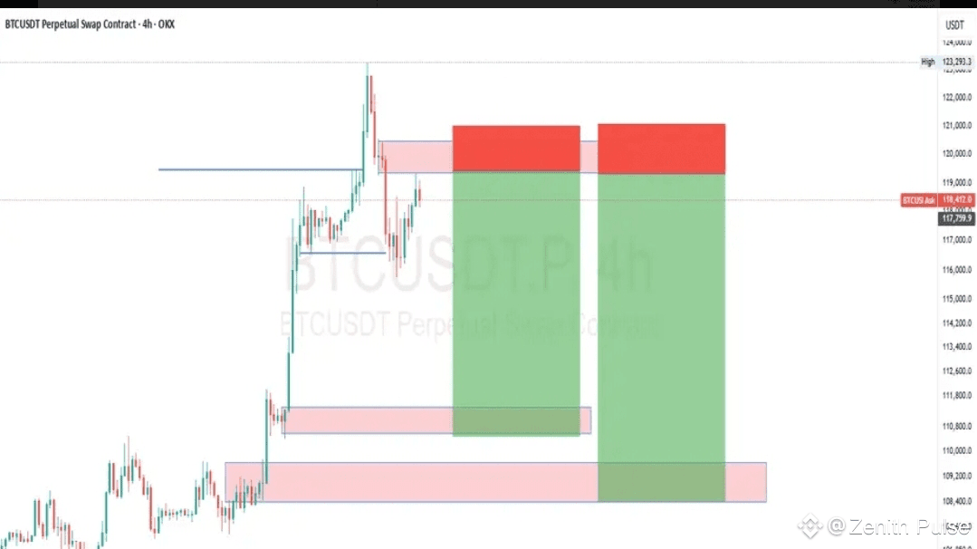 BTC może spaść do $116K, lub głębiej do $112K, podczas gdy trawi zyski—są to idealne strefy ponownego wejścia, jeśli struktura pozostanie stabilna.