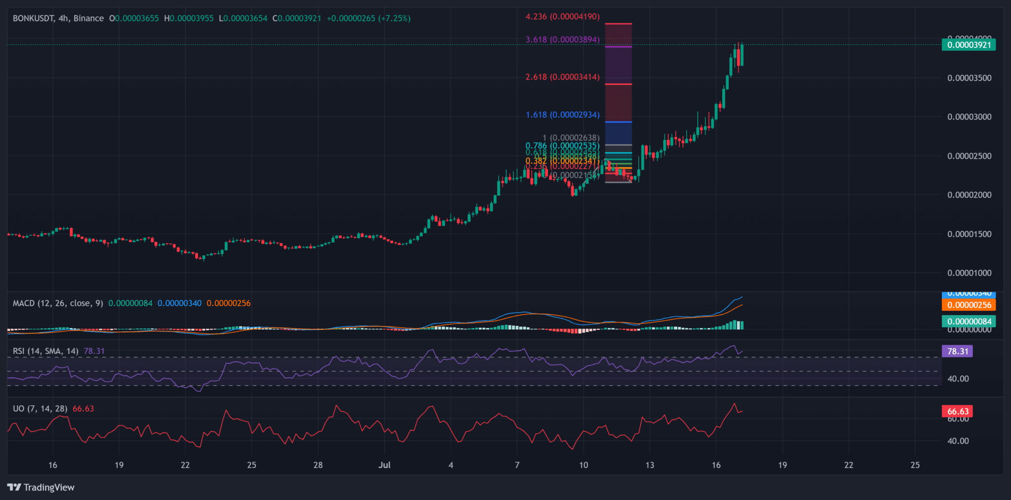 4-godzinny wykres BONK pokazuje podręcznikowe wybicie byka wspierane przez silny wolumen. Cena przekroczyła poziom 3.618 Fibonacciego na $0.00003894 i teraz zbliża się do rozszerzenia 4.236 na $0.00004190.