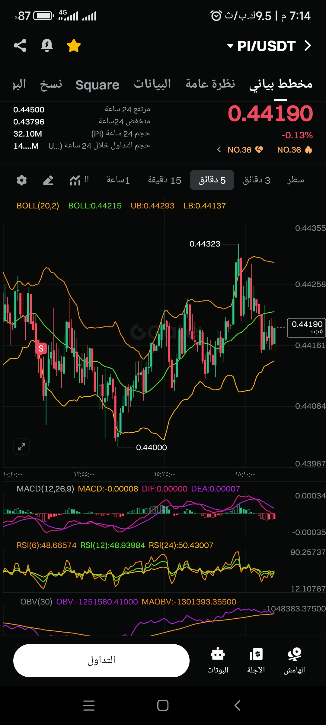 * Bieżąca cena (0.44171) znajduje się między średnią granicą (BOLL:0.44214) a dolną granicą (LB:0.44134).
