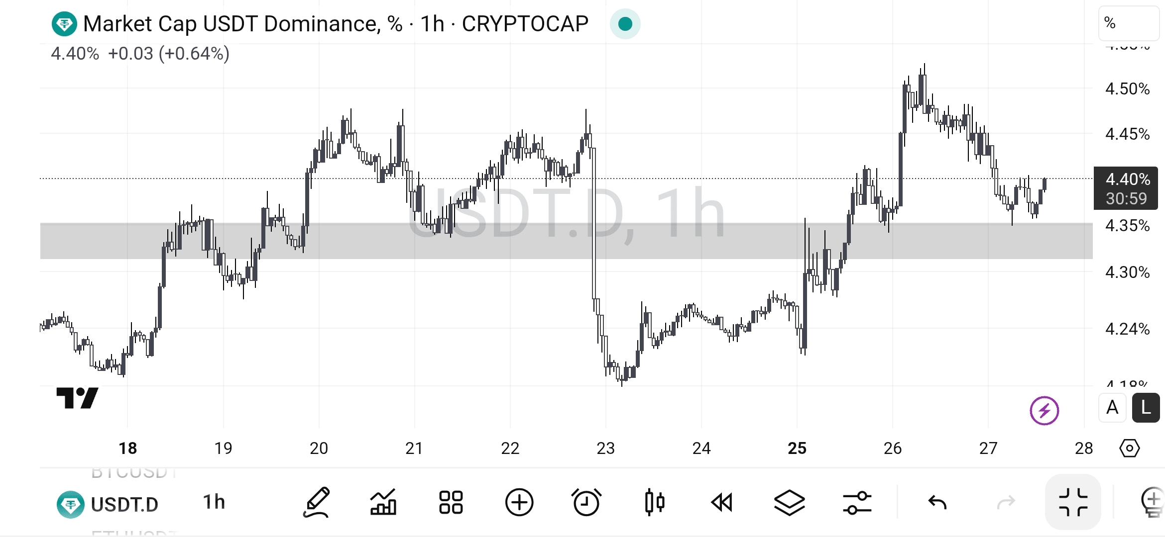 Struktura rynku i trend: Na wykresie 1-godzinnym (H1), USDT.D wydaje się być w fazie konsolidacji po wzroście z poziomu ~4.17% do ~4.55%. Cena obecnie testuje silną poziomą strefę wsparcia (oznaczoną szarym prostokątem).