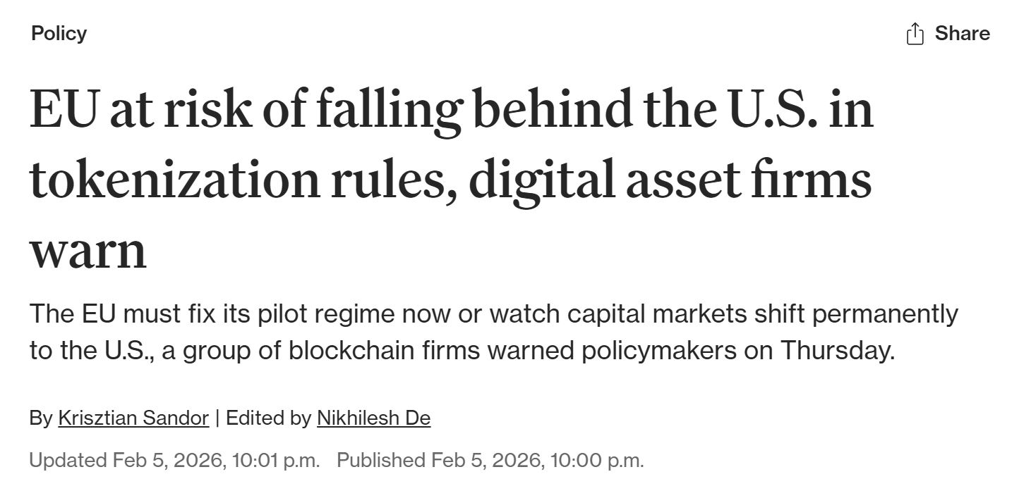 Securitize i osiem innych firm regulowanych przez UE ostrzegają, że UE może pozostać w tyle za USA w kwestii regulacji tokenizacji.