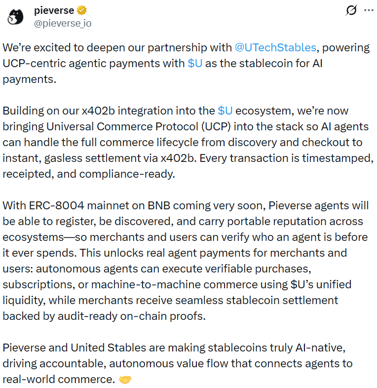 Pieverse współpracuje z U, aby wykorzystać stabilną monetę U do wspierania płatności agentów AI.