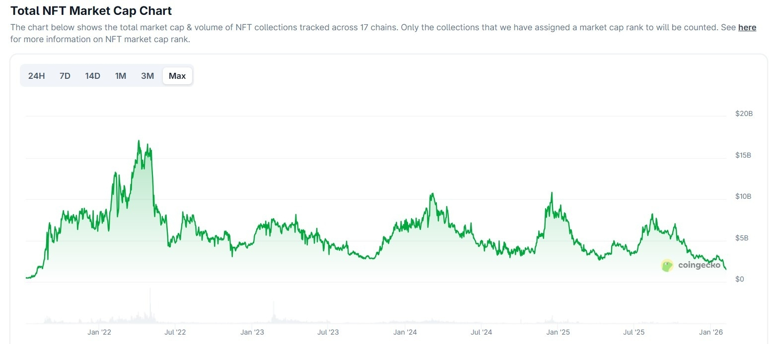 CryptoSlam数据显示,2025年流通中的NFT数量接近13亿,同比2024年增长25%。NFT总销售额同比下滑37%至56亿美元,平均成交价已跌破100美元。