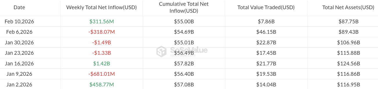 现货比特币ETF本周流入达3.11亿美元,几乎抵消了上周3.18亿美元的流出,尽管比特币下跌了13%。