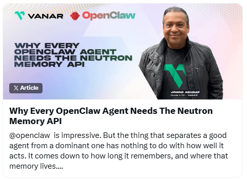 Na żywo rozmowa z Binance dotycząca stosu AI Vanara, pamięci trwałej, Neutronu dla budowniczych OpenClaw i jak wygląda infrastruktura agentów w przyszłości.