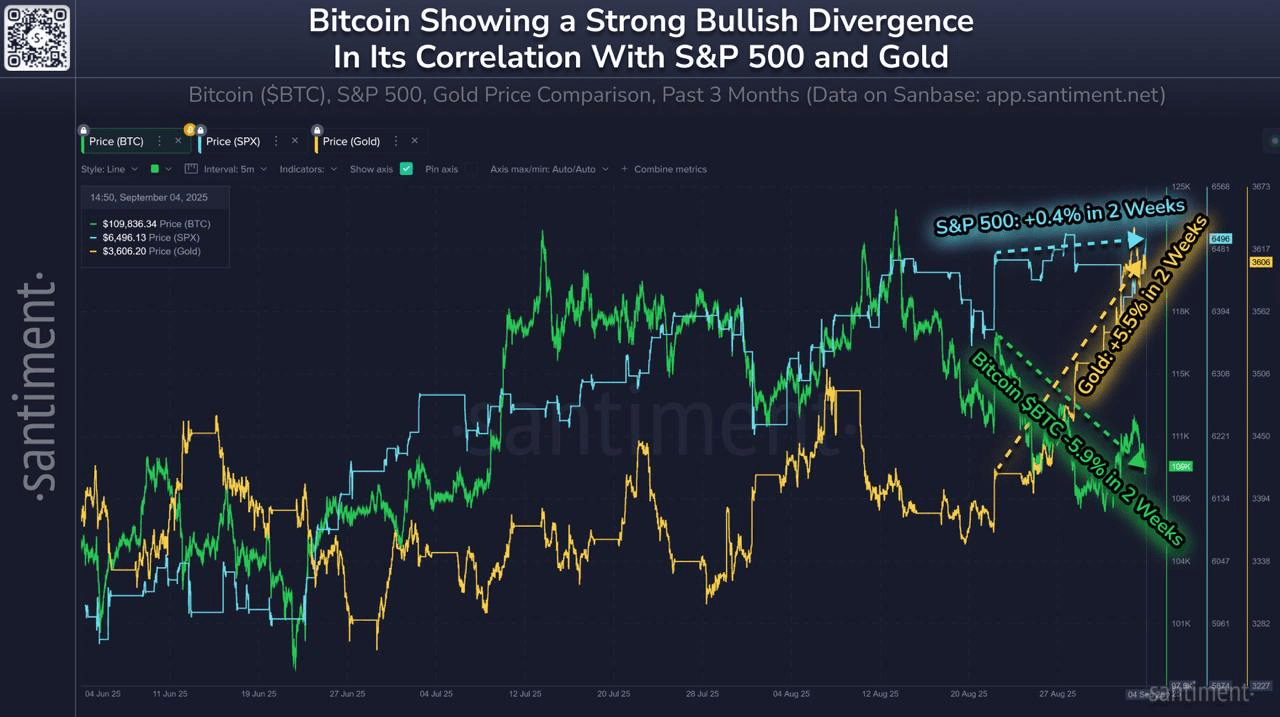 📊 NOWOŚĆ: Bitcoin pokazuje dużą byczą dywergencję, spadając o 5,9%, podczas gdy S&P 500 rośnie o 0,4% i złoto zyskuje 5,5% od 22 sierpnia.