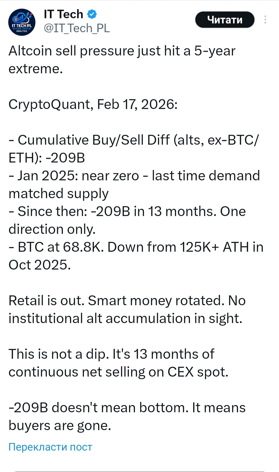🔍 Z danych CryptoQuant wynika, że skumulowana różnica między zakupami a sprzedażami altcoinów (bez Ethereum) osiągnęła -$209 miliardów.🤯 W styczniu 2025 roku wskaźnik był bliski zera, a teraz — 13 miesięcy czystego odpływu kapitału z giełd. To wskazuje na całkowity brak stabilnego popytu, z wysokim wolumenem depozytów altcoinów (40-78 tys. transakcji dziennie od lipca 2025 roku). Analitycy mówią, że samo -$209 miliardów nie sygnalizuje dna, ale to rekordowa presja sprzedających!