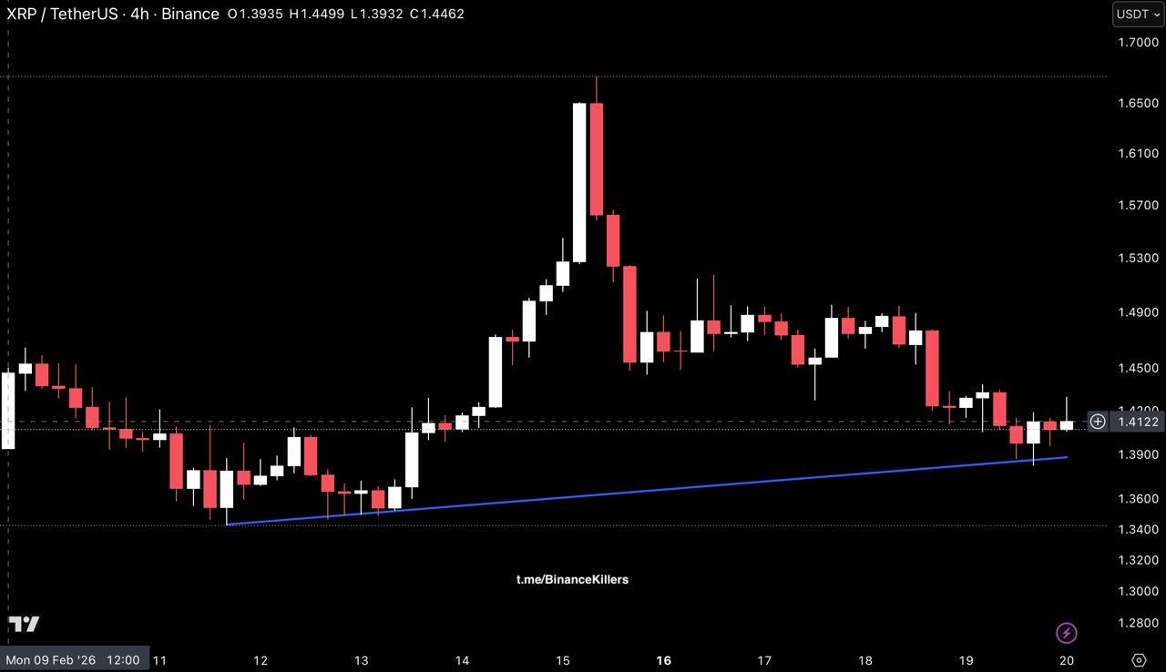 O gráfico de 4H do $XRP continua respeitando a linha de tendência ascendente. O preço está sendo negociado em torno de US$ 1,41, mantendo-se acima do suporte ascendente próximo de US$ 1,38–1,39 após o recuo recente a partir da máxima de US$ 1,65.