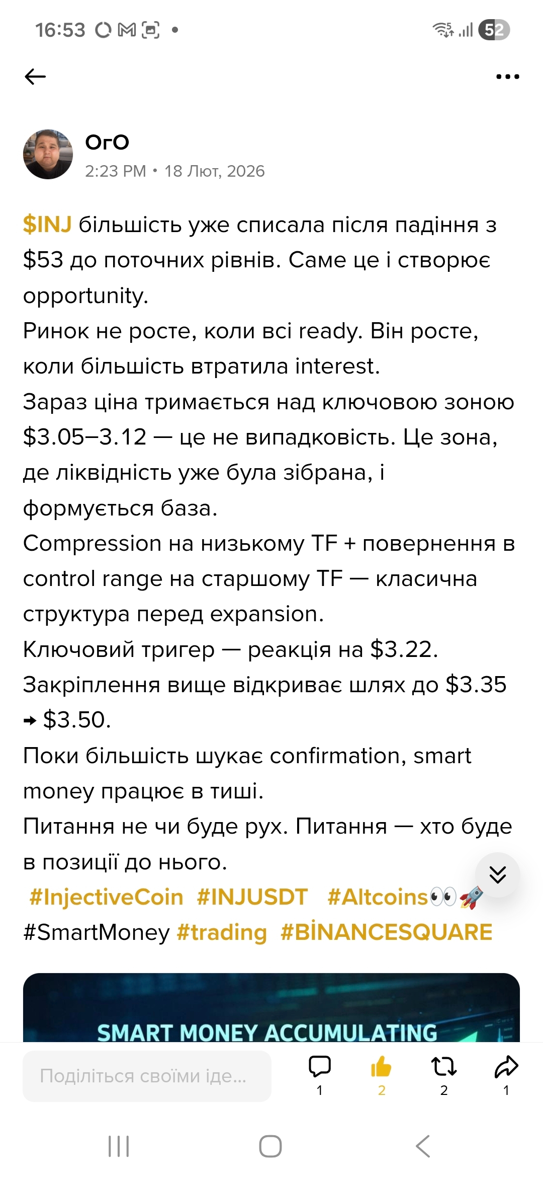 18 lutego ja pisałem: «Kompresja na niskim TF + powrót do zakresu kontrolnego — klasyczna struktura przed ekspansją. Kluczowy trigger — reakcja na $3.22. Utrwalenie otwiera drogę do $3.35 ➝ $3.50».