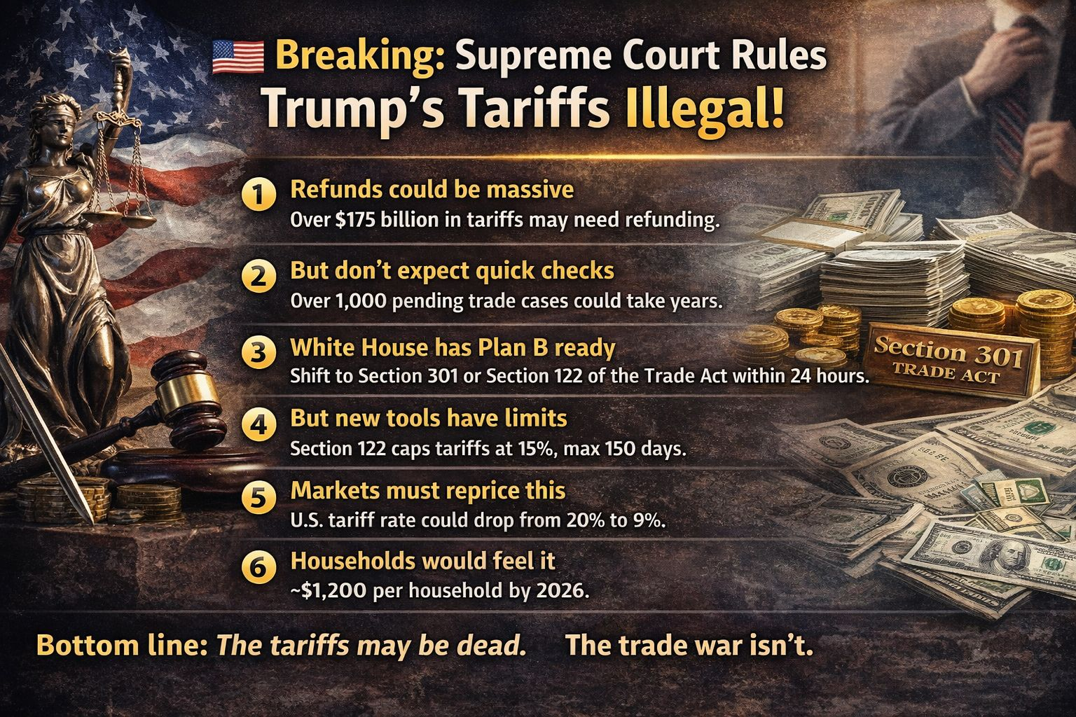 Under this ruling, more than $175 billion in collected tariffs may need to be returned to importers. Estimates from Wharton put it around $175–179 billion.