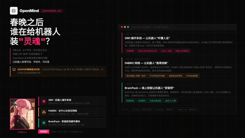 W tej strukturze, @fabricFNd $ROBO bardziej przypomina medium wartości w sieci robotów, niż czysty token. Gdy tożsamość, współpraca i usługi robotów odbywają się w sieci, wartość naturalnie osadza się na poziomie sieci. Projekt OpenMind, prowadzony przez profesora Stanforda, otrzymał 20 milionów dolarów finansowania, a partnerzy ekologiczni (Magic Atom, Songyan Power) już wystąpili na scenie wiosennej gali, co samo w sobie jest symbolicznym sygnałem - roboty przechodzą z narracji science fiction do społecznej rzeczywistości.