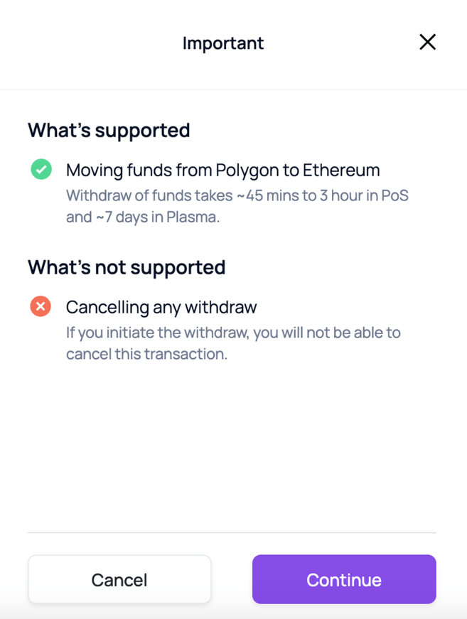 Jak wspomniano, w sieci Polygon są dwa mosty: Most Plasma i Most PoS. Czas wypłaty różni się w zależności od mostu Polygon, którego używasz. Wypłata z Mostu PoS zazwyczaj trwa od 45 minut do 3 godzin, podczas gdy Most Plasma może zająć do 7 dni.