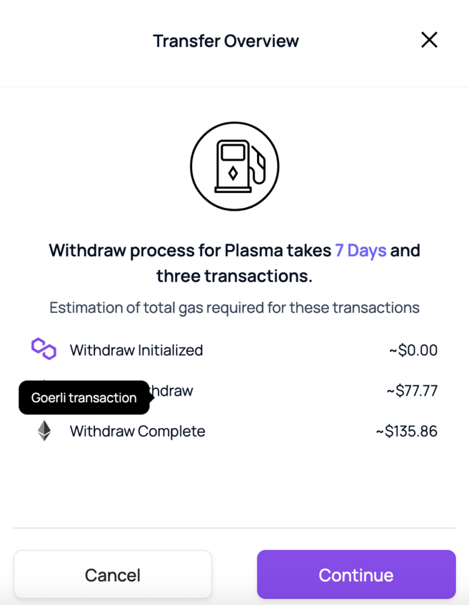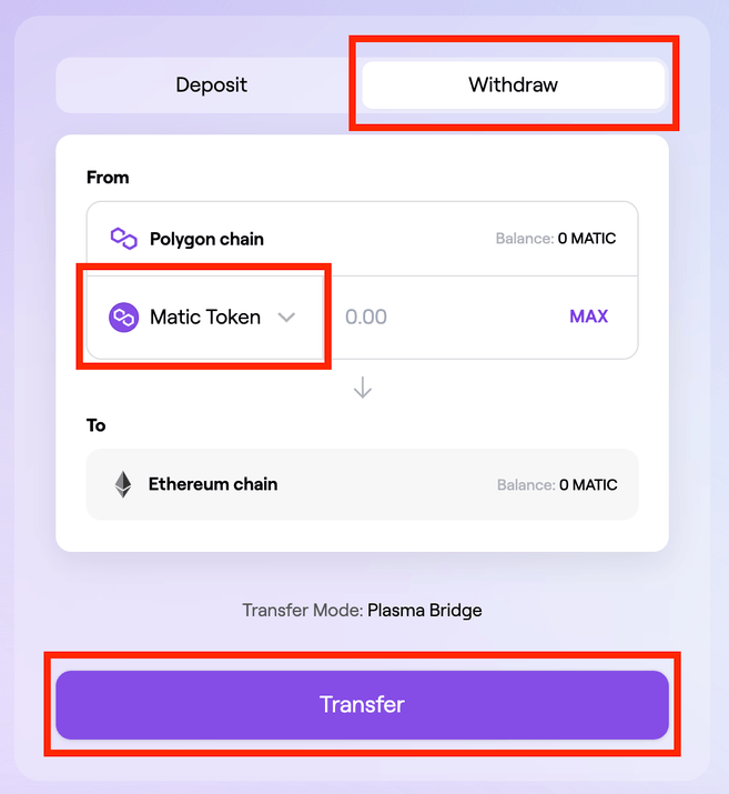 Jeśli chcesz przenieść MATIC lub inne tokeny Polygon do Ethereum, możesz to zrobić za pomocą Mostu Plasma. Zauważ, że Most Plasma obsługuje tylko transfer tokenów ERC-20 i ERC-721, które obejmują ETH i MATIC.