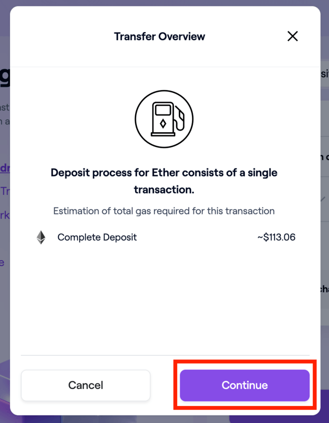 5. Zobaczysz również wyskakujące okno [Przegląd transferu] z szacunkową opłatą gazową za tę transakcję. Jeśli zgadzasz się na koszty gazu, kliknij [Kontynuuj], aby przejść dalej.