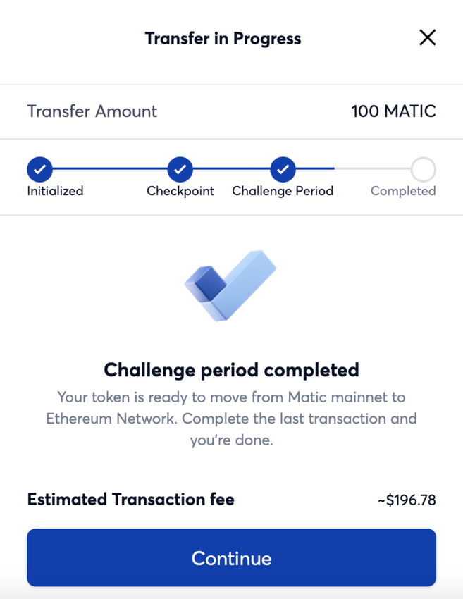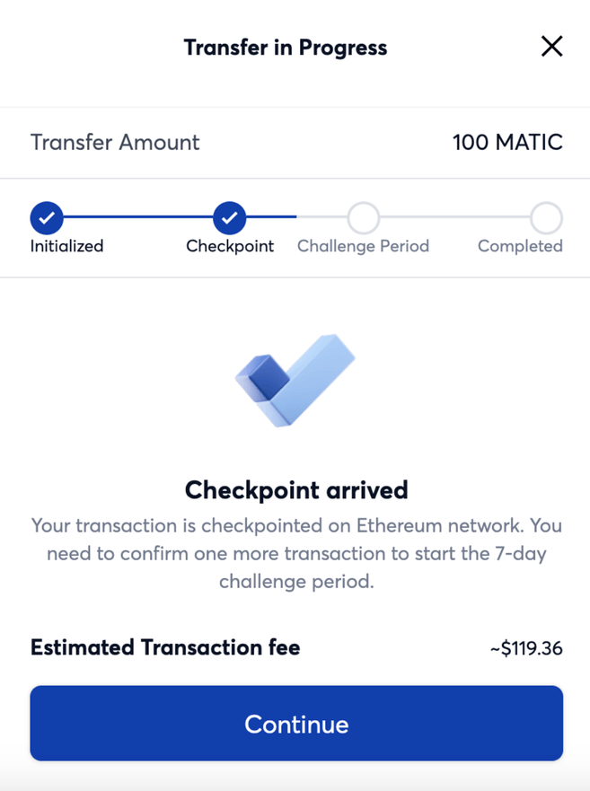 6. Gdy punkt kontrolny dotrze, oznacza to, że Twoja transakcja została zweryfikowana w blockchainie Ethereum. Musisz potwierdzić drugą transakcję, aby rozpocząć okres wyzwania. To środek mający na celu zwiększenie bezpieczeństwa transakcji wypłat.