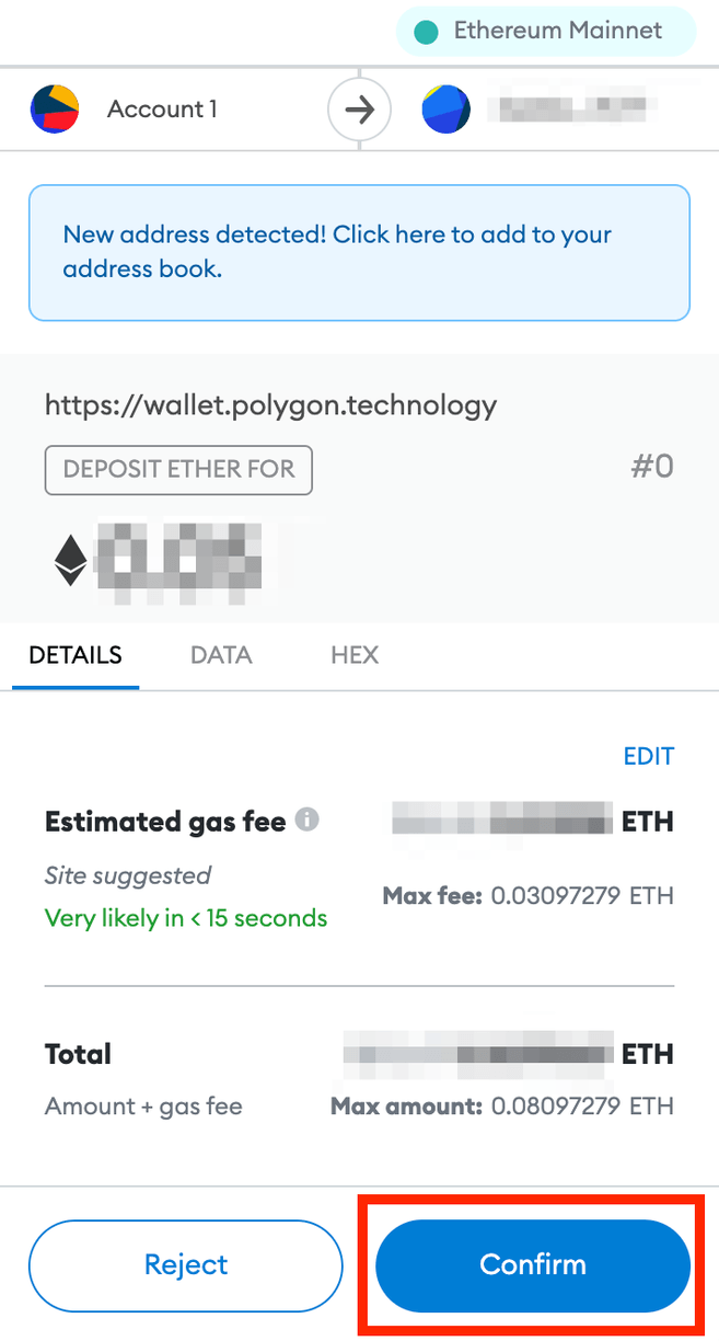 7. Musisz podpisać i zatwierdzić transfer w swoim portfelu MetaMask. Sprawdź, czy dane są poprawne i kliknij [Potwierdź].