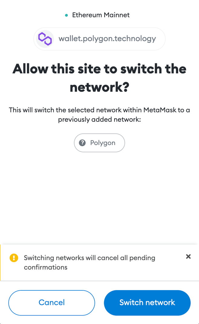 Istnieją dwie metody dodania sieci Polygon do swojego portfela MetaMask. Domyślną metodą jest dodanie jej ręcznie (patrz Jak dodać Polygon do MetaMask). Możesz również użyć interfejsu portfela Polygon, aby szybko dodać Polygon do listy sieci MetaMask.