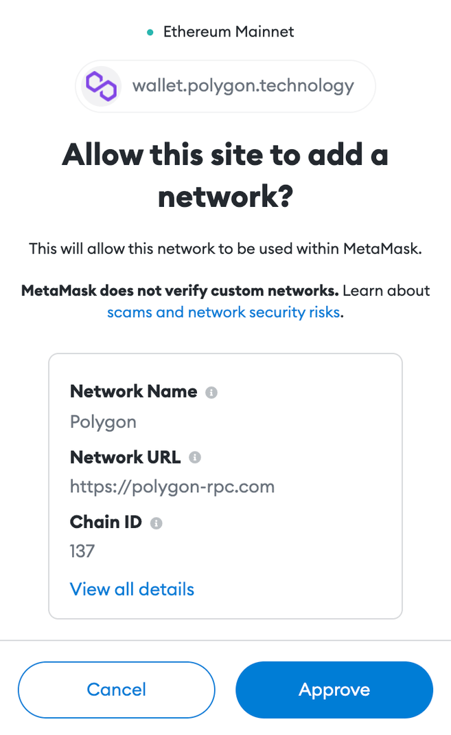 2. Zobaczysz wyskakujące okno z rozszerzenia MetaMask z danymi sieci Polygon. Kliknij [Zatwierdź].