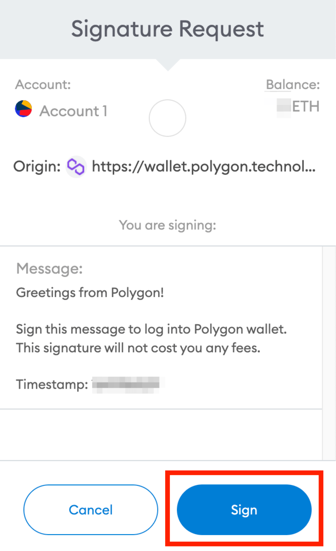 3. Zostaniesz poproszony o podpisanie wiadomości, aby połączyć swój portfel MetaMask z portfelem Polygon. Ten podpis nie będzie kosztował żadnych opłat. Sprawdź URL, aby upewnić się, że jesteś na poprawnej stronie i kliknij [Podpisz], aby kontynuować.