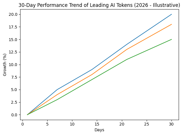 The line chart above presents an illustrative 30-day performance comparison of three leading AI-based cryptocurrencies listed on Binance in 2026: Bittensor (TAO), Fetch.ai (FET), and Render Network (RNDR).