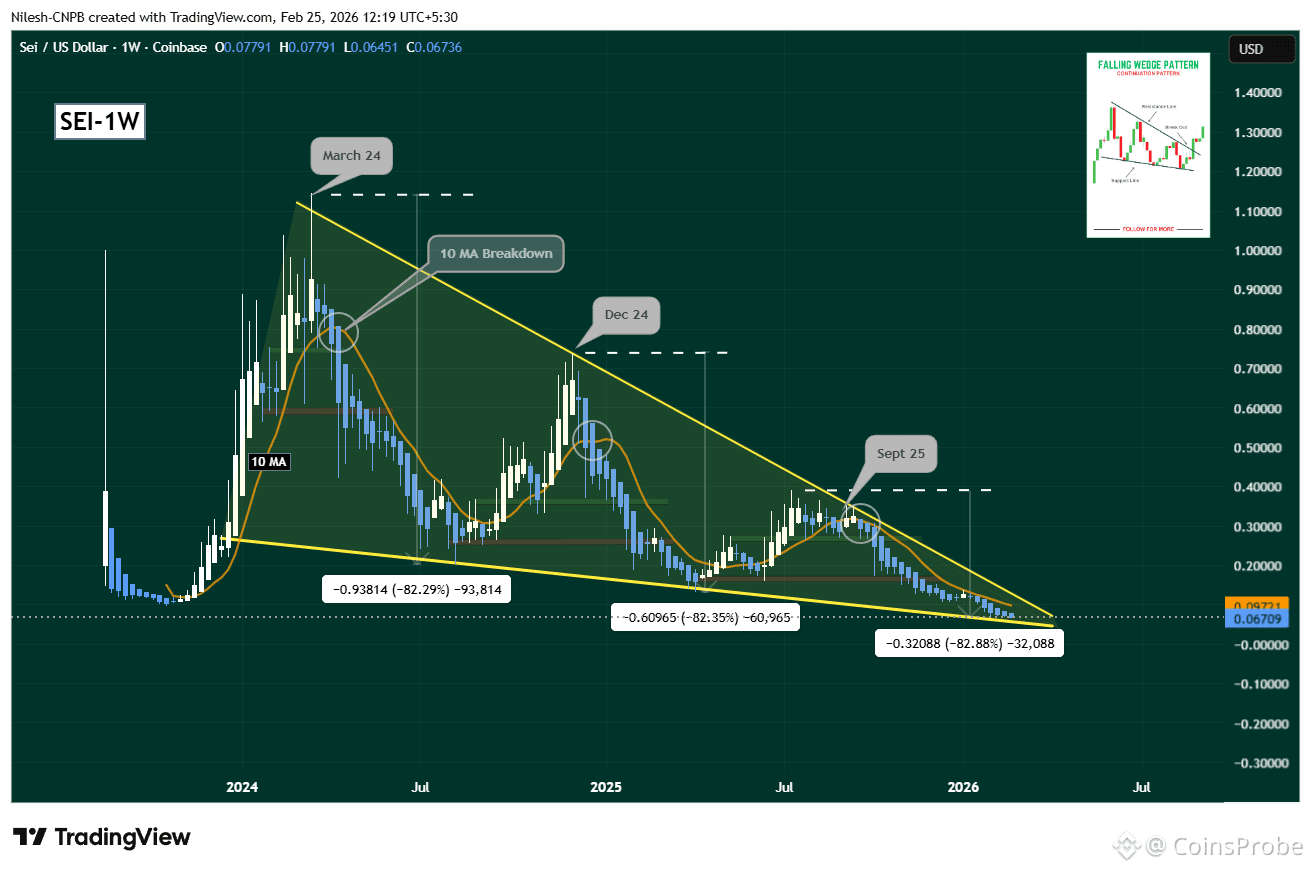 The latest leg of the correction began in September 2025 when SEI faced rejection at the upper boundary of the wedge near $0.35. That rejection triggered a breakdown below the 10-week moving average (10 MA), accelerating selling pressure. Since then, the token has plunged nearly 82%, dropping to around $0.067 — right near the lower boundary support of the wedge.