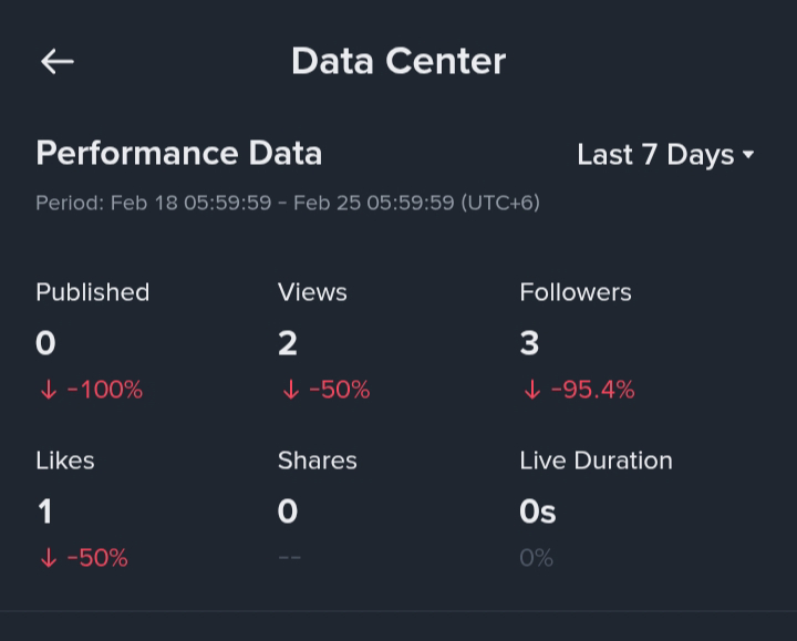 Na podstawie moich ostatnich 30 dni danych, mogę wyraźnie zobaczyć, że moje wyświetlenia, polubienia, udostępnienia i obserwatorzy znacznie maleją.