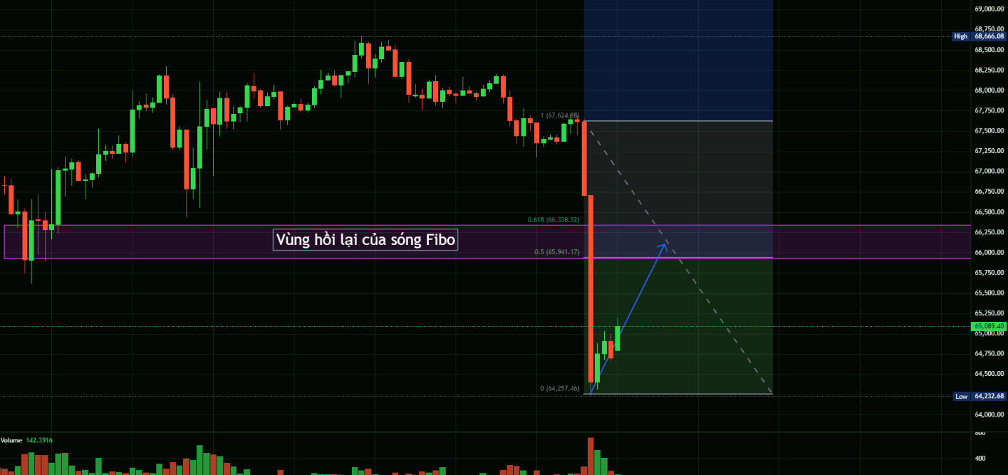 - Hỗ trợ ngắn hạn: 64,250 – 64,500 USD (đáy vừa tạo).Cá nhân mình coi nhịp tăng hiện tại là cơ hội để quan sát hành vi giá tại vùng Fibo hồi.
