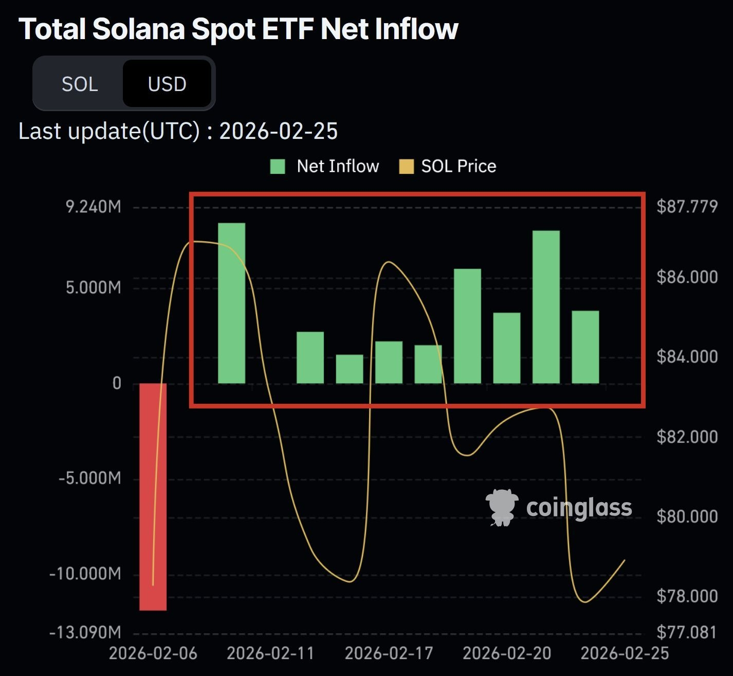Od 7 lutego, fundusze ETF Solana nie odnotowały ani jednego dnia odpływu. Ani jednego. Podczas gdy cena dryfowała z wysokich 80 $ w kierunku wysokich 70 $, pieniądze instytucjonalne wciąż napływały. Na początku okresu był duży dzień napływu blisko 9 milionów $. Potem nastąpił stały okres od 1 do 3 milionów $ dziennie. Później napływy przyspieszyły do zakresu od 3 do 5 milionów $. Następnie nastąpił kolejny skok.