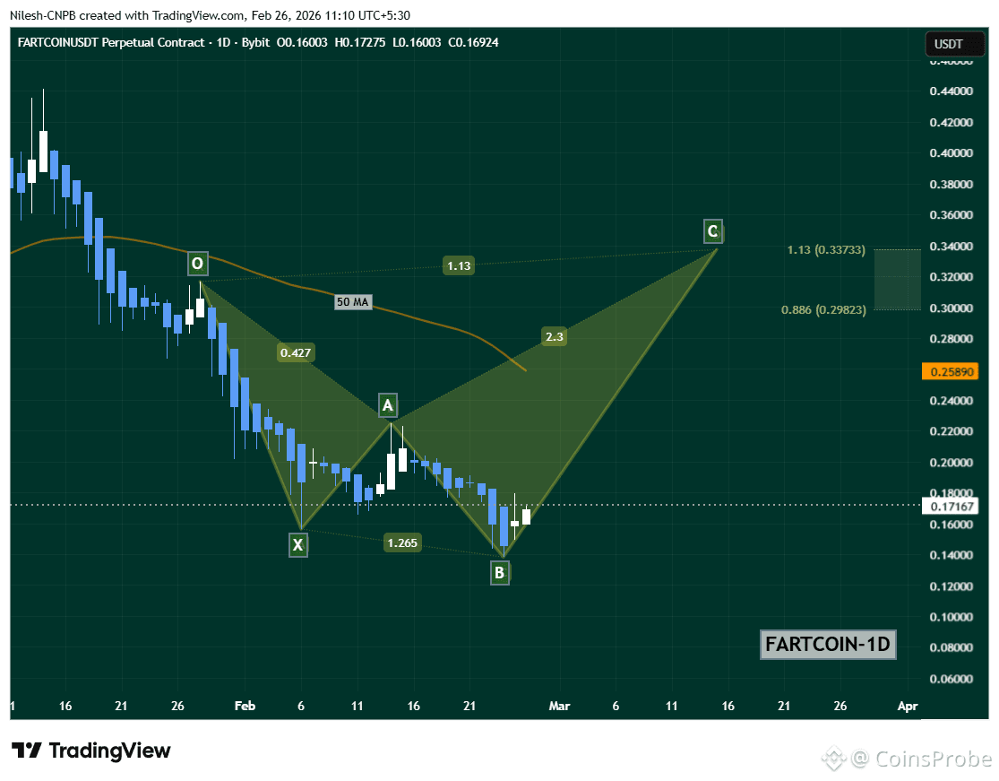 $FARTCOIN is currently trading near $0.17, showing early signs of stabilization after the recent sell-off. The ability to hold above the B-point strengthens the case for a short-term continuation toward the projected harmonic completion levels.