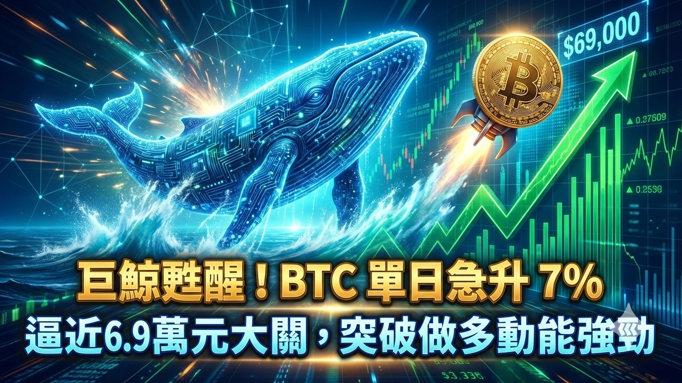在經歷短暫盤整後,Bitcoin (BTC) 於過去 24 小時內爆發強勁動能,單日急升逾 7%,價格強勢逼近 $69,000 的關鍵心理與歷史阻力位。據 Bloomberg 與 CoinDesk 報導,此次旱地拔蔥式的大漲,主因受惠於現貨 ETF 再度湧現大規模機構淨流入,市場看漲情緒被瞬間點燃。