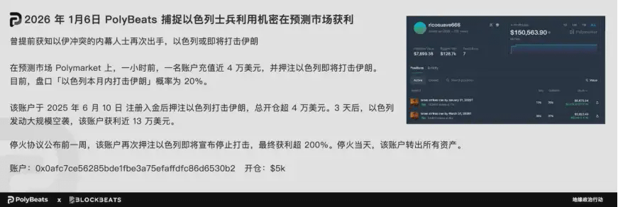 而早在 2026 年 1 月 6 日,PolyBeats 在 ricosuave666 押注以伊冲突一小时后便将该账号定性为内幕人士,并在频道中对账号过往内幕交易及最新相关进展进行播报。