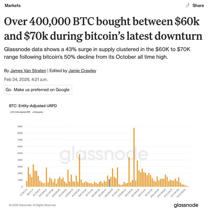 Coindesk: “Hơn 400,000 BTC được mua trong vùng giá 60,000–70,000 USD trong đợt điều chỉnh gần đây của Bitcoin”