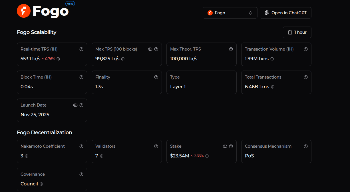 Zgodnie z publiczną platformą analityczną Chainspect (która śledzi metryki wydajności na żywo, takie jak TPS, czasy bloków i finalność na dziesiątkach łańcuchów), @Fogo Official zarejestrowano szczyt 99,825 transakcji na sekundę na głównym łańcuchu.