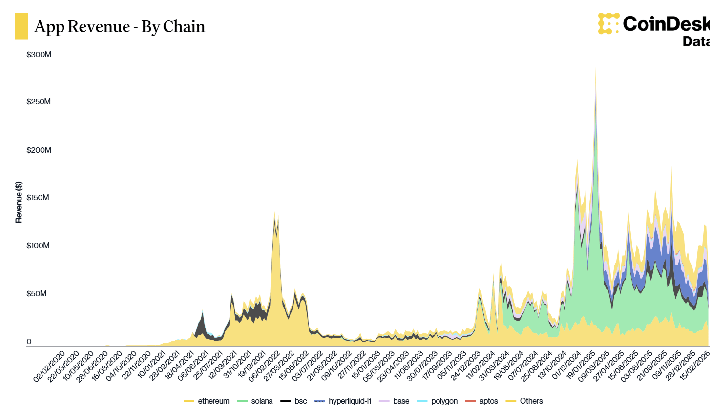 Weekly application revenues now average between $50M and $70M, with peaks exceeding $250M during periods of high activity. This marks a significant shift from earlier cycles, where revenue was limited to a small number of protocols and networks.