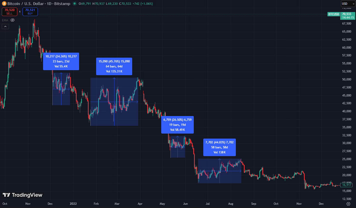 Podczas rynku niedźwiedzi dominują niższe szczyty i niższe minima, tworząc wyraźny trend spadkowy na większości ram czasowych. Sentyment inwestorów i rynku również decyduje się na negatywny, gdzie strach i niepewność zastępują optymizm, który charakteryzował poprzedni rynek byka.