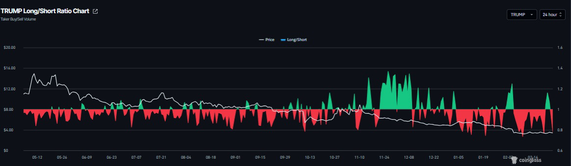 بالإضافة إلى ذلك، فإن نسبة المراكز الطويلة إلى القصيرة لـ TRUMP تقف عند 0.78 يوم الجمعة، بالقرب من أدنى مستوى لها في أكثر من شهر. تشير هذه النسبة التي تقل عن 1 إلى معنويات هبوطية حيث يراهن المتداولون على انخفاض سعر عملة الميم.